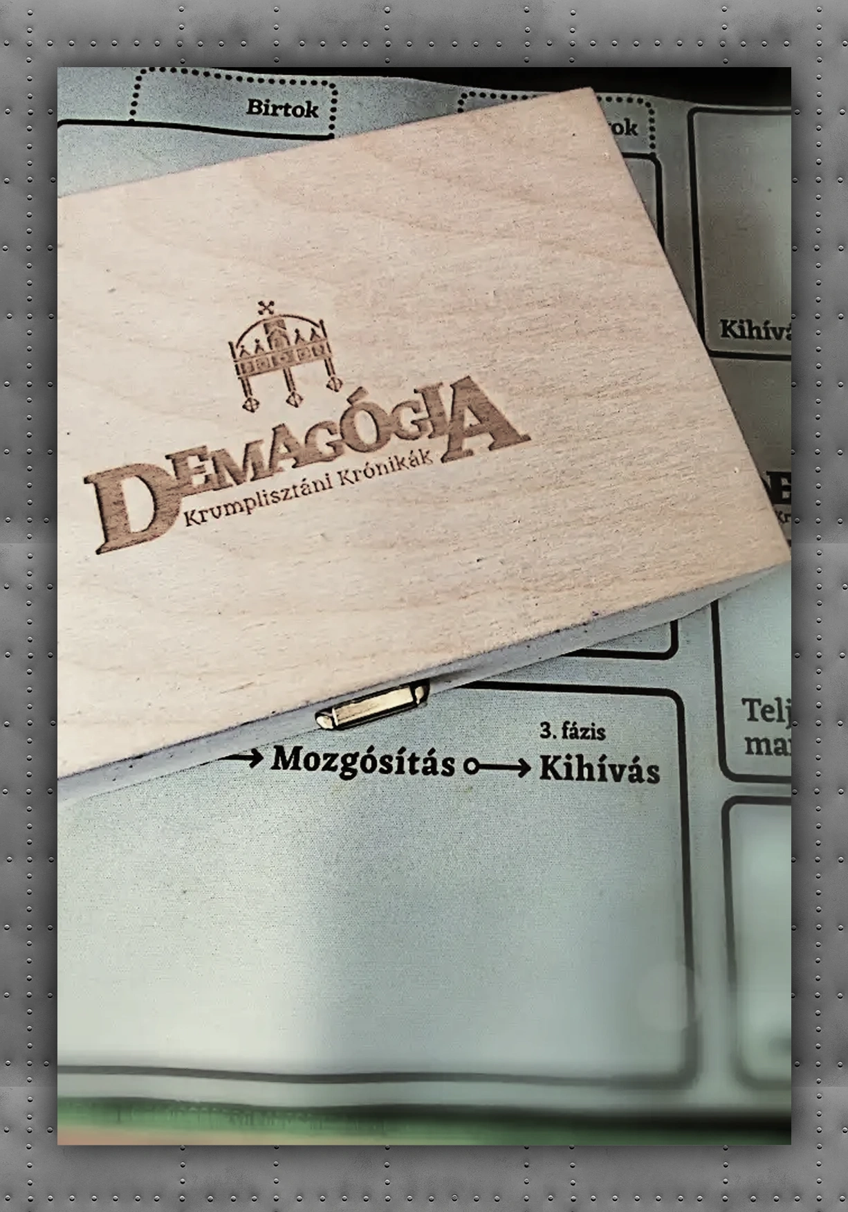 Ez a kézzel készített fa paklitartó doboz tökéletes választás a Demagógia kártyáid biztonságos tárolására és szállítására.